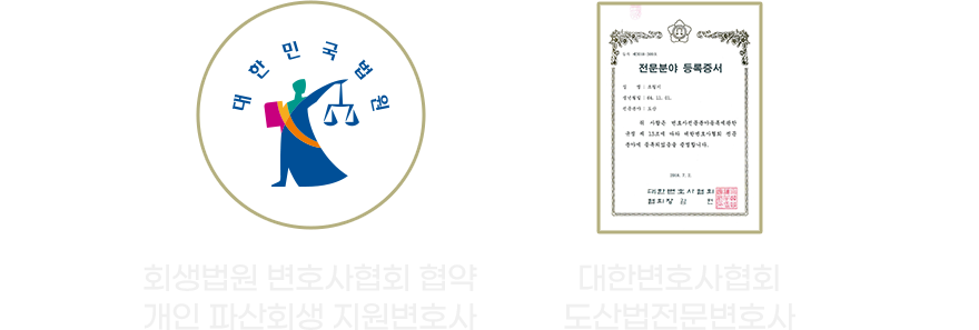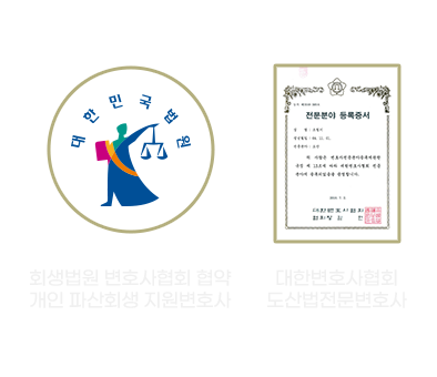 대한변호사협회 등록 전문변호사 인증(도산)은 물론 회생법원과 협약 등록된 개인파산회생전문변호사 여부를 반드시 확인합니다. |